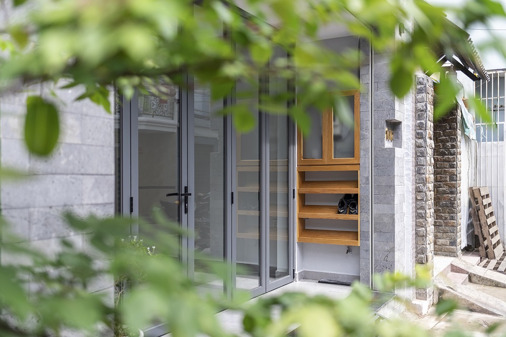 Với hệ thống đá tổ ong xám ốp tường mặt tiền – giữa nhà - phía sau nhà, tạo sự liền mạch và kết nối trong ngôn ngữ kiến trúc.