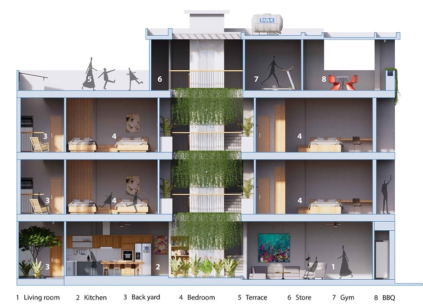 Theo Acspace, với những yêu cầu đó của chủ nhà, các kiến trúc sư đề xuất phương án giữ nguyên kết cấu cũ, đập bỏ cầu thang hiện có và dời vào phía sau. Tạo ra một bố cục cân bằng hơn giữa trước và sau, với cầu thang và thang máy ở giữa.