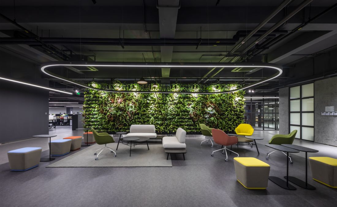 Bên cạnh đó, yếu tố tự nhiên cũng được ưu tiên trong thiết kế nội thất văn phòng, điển hình với bức tường xanh tại khu vực lễ tân và khu vực nghỉ ngơi. Việc sử dụng các vách ngăn kính nổi bật nhằm tối ưu hóa cảm giác không gian mở và đón nhận ánh sáng tự nhiên.
