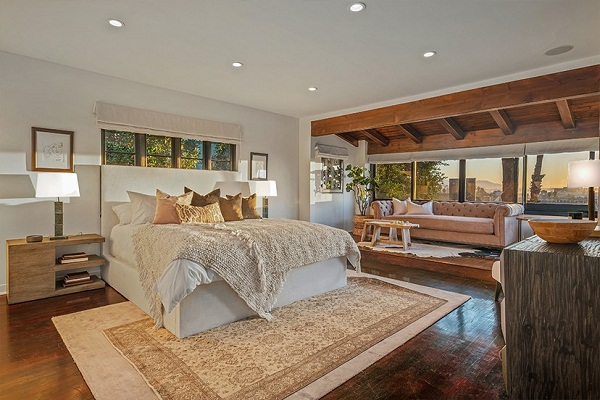 Căn phòng ngủ có không gian rộng hơn nhờ thêm vào khu thư giãn với sàn gỗ được thiết kế cao hơn một bậc so với sàn phòng chính. Bộ ghế sofa gam màu hồng nhẹ nhàng được đặt ngay khung cửa kính đón ánh nắng tự nhiên và cho tầm nhìn toàn cảnh thành phố Los Angeles xinh đẹp.