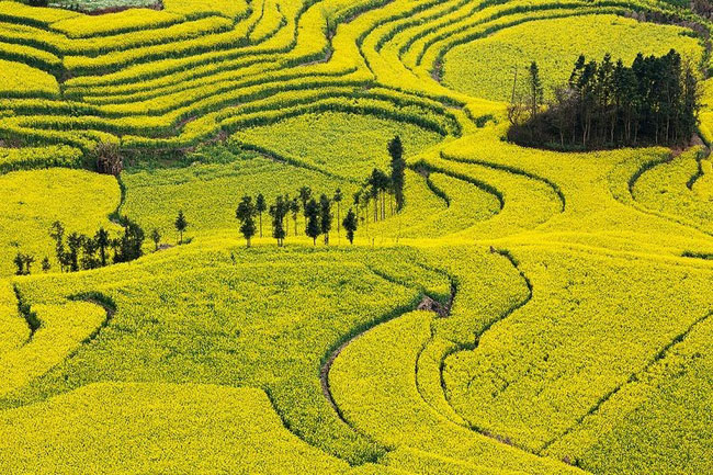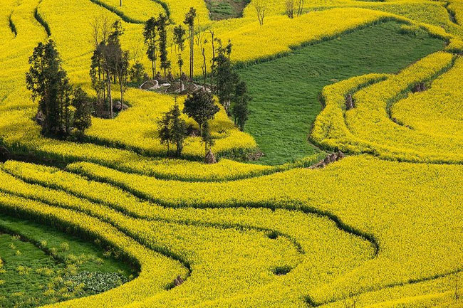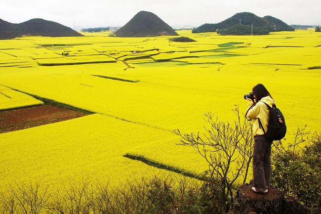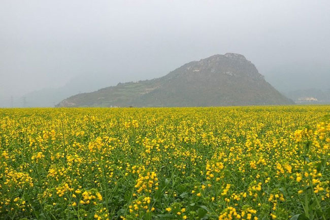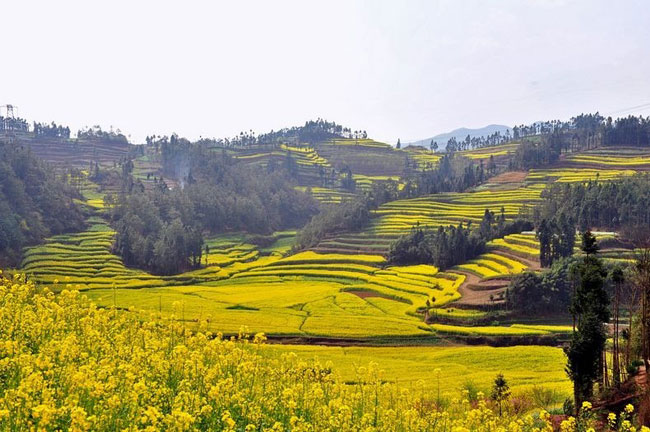 Vị trí nổi tiếng nhất để xem hoa cải dầu là ở Jinjiifeng (Đỉnh gà vàng). Nó nằm cách thành phố chỉ vài cây số và bạn cố thể đến đây dễ dàng bằng xe buýt. Cảnh vật nơi đây thật yên bình, được tô điểm bằng những ngọn đồi nhỏ phá vỡ sự đơn điệu của khung cảnh. Các luống hoa được trồng trong các vòng tròn theo đường viền của các sườn núi giống như ruộng bậc thang vậy.