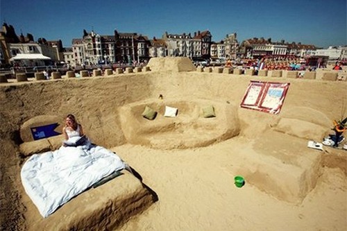 Khách sạn cát trên bãi biển Weymouth, Anh: Một đội ngũ chuyên nghiệp chỉ phải mất khoảng 1 tuần để xây dựng xong khách sạn độc đáo này. Khoảng 1.000 tấn cát đã được sử dụng cho công trình này. Nội thất trong phòng như giường hay khu vực phòng khách cũng được làm từ cát. Một đêm tại đây có giá từ 10 euro trở nên.