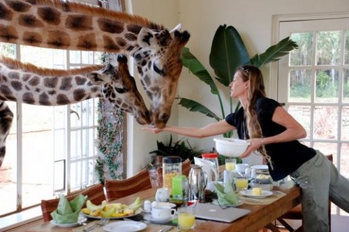 Khách sạn hươu cao cổ, Kenya: Những chú hươu cao cổ hoang dã được thuần hóa sẽ nô đùa ở những khu vực quanh khách sạn để chờ khách cho ăn. Trên mỗi bàn ăn sáng của khách, đồ ăn của hươu cũng được bày sẵn.