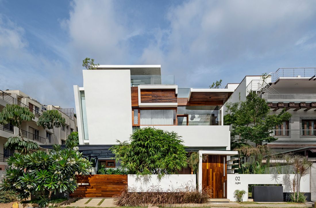 Những tấm bê tông trắng kết hợp với gỗ ốp được xếp chồng lên nhau tạo nên một vẻ ngoài khá lạ mắt và thú vị cho ngôi nhà ở Ấn Độ này.