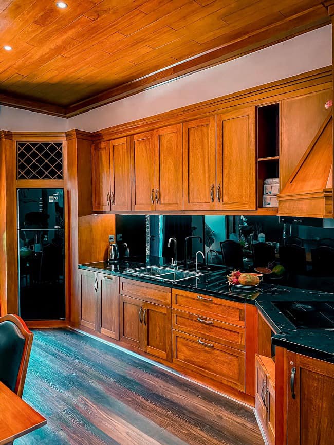 Khu vực bếp rộng rãi với hệ tủ bếp bằng gỗ được gia chủ “đo ni đóng giày” chuẩn kích thước từng món đồ gia dụng nhỏ.