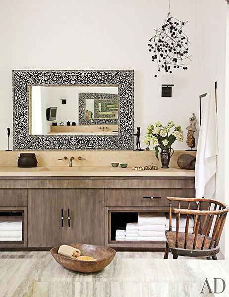 Một góc phòng tắm với mặt sàn được lát đá cẩm thạch. Chiếc gương khảm ngọc trai có xuất xứ từ Ấn độ.