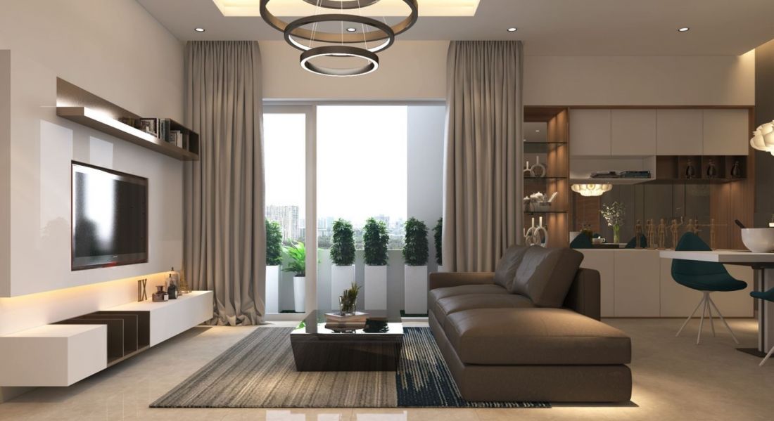 Thiết kế nội thất phòng khách mang phong cách hiện đại với rèm cửa màu sáng.