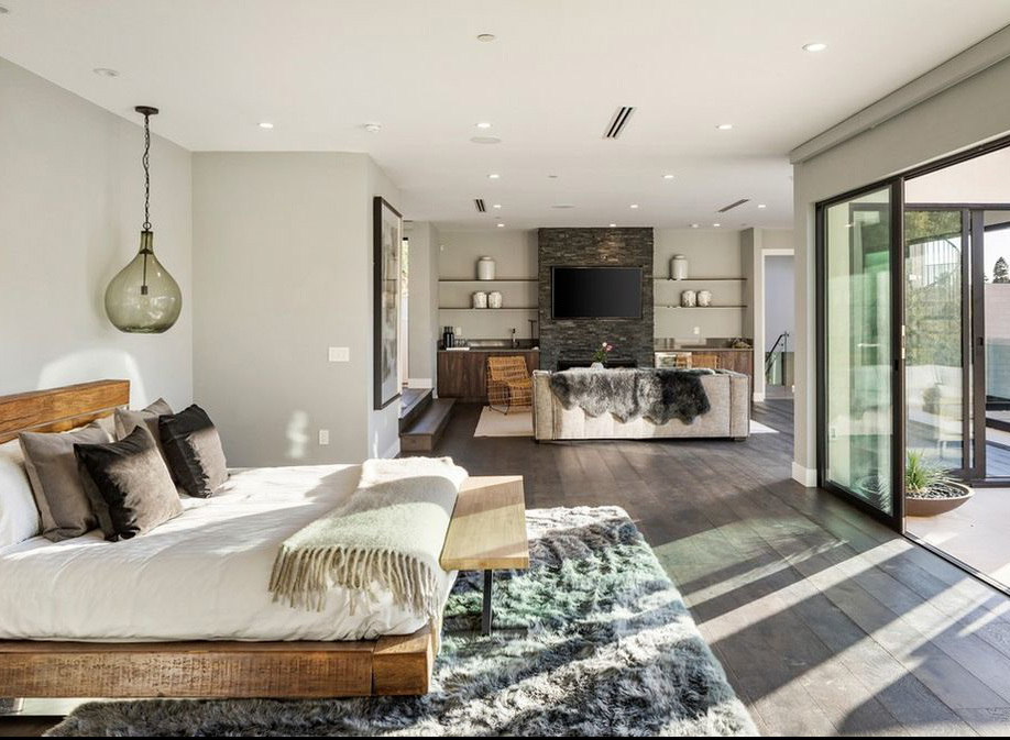 Phòng ngủ chính rộng rãi, được tích hợp với khu vực tiếp khách, quầy bar, khu vực làm việc, phòng chứa quần áo, phòng tắm và ban công.