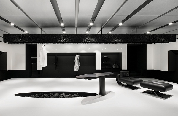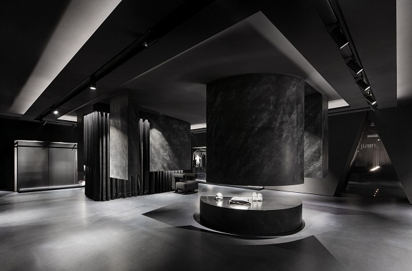 Ở tầng trên, không gian đồ nam giới tối màu bị chi phối bởi các khối hình chữ nhật và hình bán nguyệt nội thất đen sì.