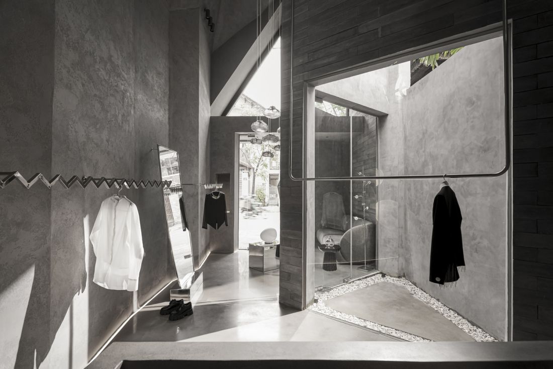 Mặt tiền cửa hàng thời trang được thiết kế ấn tượng lạ mắt vừa tạo được sự riêng tư vừa kích thích sự tò mò của người đi qua đường. Phía trong một khoảng sân hình tam giác bố trí chính giữa để ánh sáng tự nhiên có thể chiếu vào mọi góc hẹp tạo nên cảm giác thoáng đãng với không gian nhỏ.