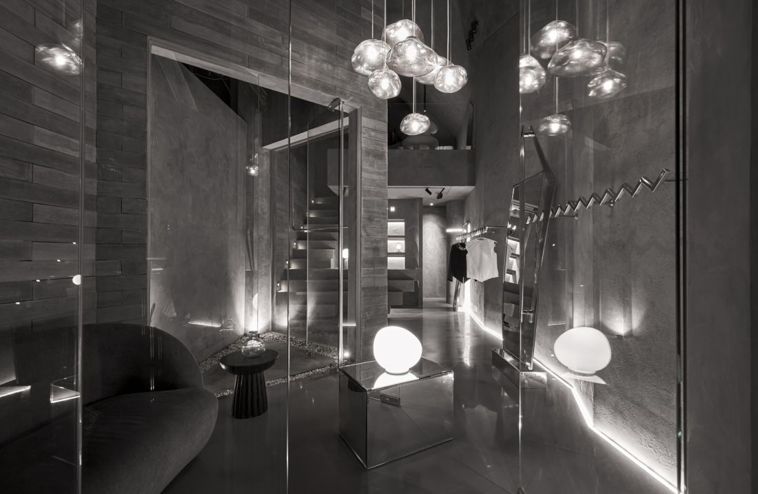Theo chia sẻ từ kiến trúc sư, vì diện tích hạn chế nên thiết kế sẽ hướng đến không gian trưng bày nhỏ gọn, chỉ tập trung vào chất lượng của một dòng sản phẩm nhất định là quần áo thanh lịch, sang trọng dành cho phụ nữ. Để làm được điều này chúng tôi tập trung vào hai yếu tố là tạo các hình khối và sử dụng hiệu ứng ánh sáng đi kèm. Vật liệu chính là bê tông và kính cường lực, trong đó gam màu chủ đạo là xám.