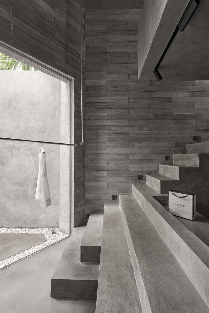 Các bậc cầu thang bê tông nguyên khối vừa có chức năng là bàn tiếp khách vừa là khu vực tiếp tân.