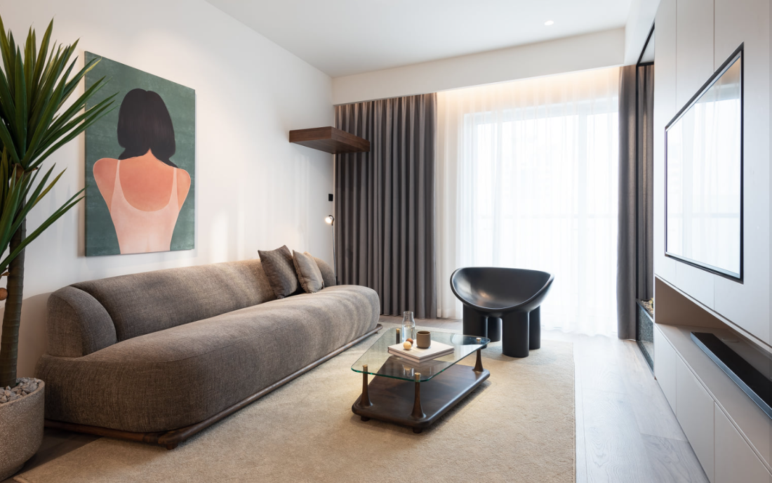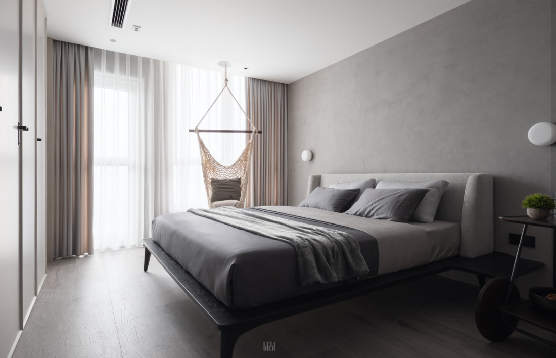 Phòng ngủ: Những đường cong bo tròn trên tường và đồ nội thất rời giúp không gian nghỉ ngơi trở nên mềm mại, giảm bớt sự khô khan của những khối vuông kỹ thuật.