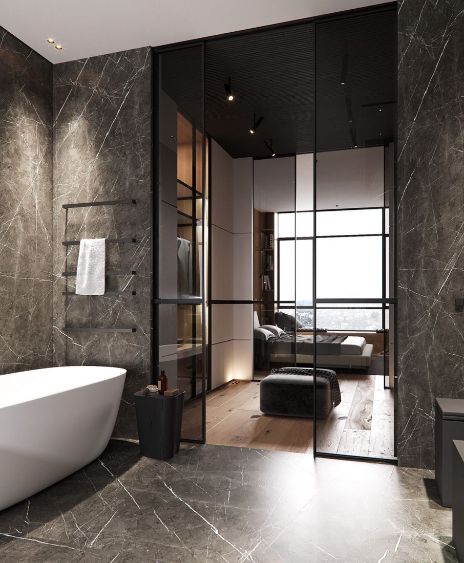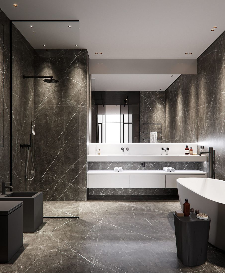 Hai màu xám trắng tạo nên sự tương phản nhẹ nhàng nhưng hấp dẫn trong phòng tắm.