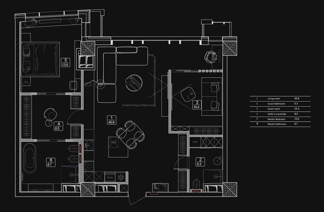 Sơ đồ cấu trúc mặt bằng không gian chữ L 96 m2 ở Ukraine.