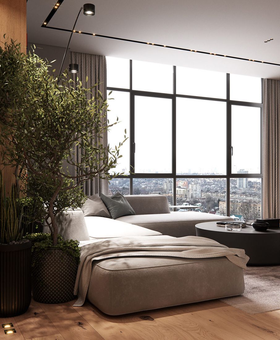Chiếc ghế sofa màu xám kết hợp cùng chậu cây xanh sẽ góp phần tạo nên một không gian tươi mới, năng động.