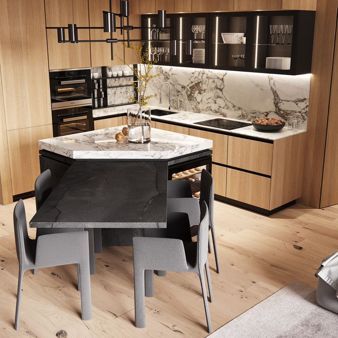 Phòng ăn trở nên thú vị hơn với đảo bếp hình lục giác.