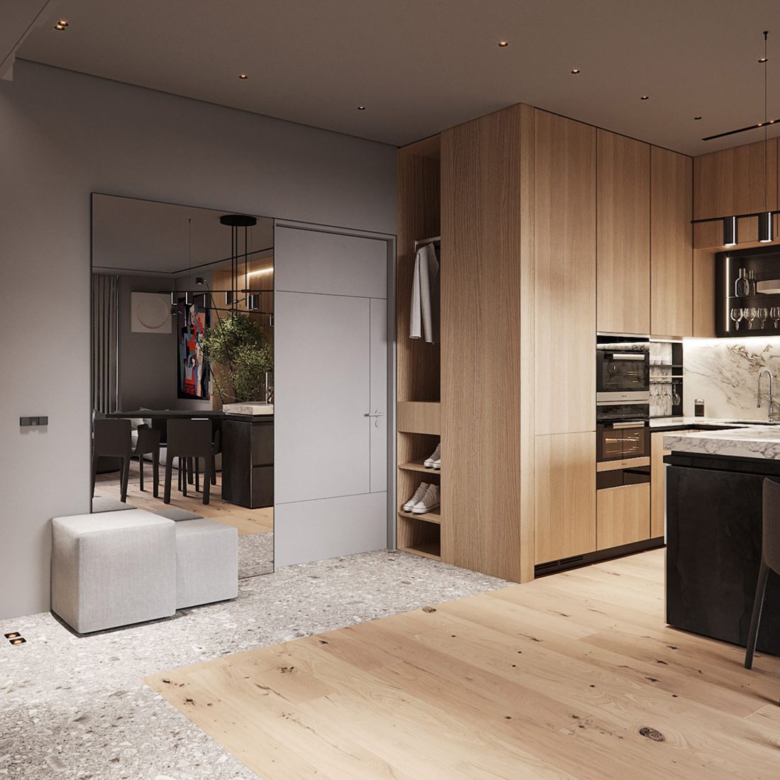 Tủ gỗ vừa lưu trữ trong khu vực bếp lại vừa đựng quần áo, dày dép. Tối ưu hóa được không gian.