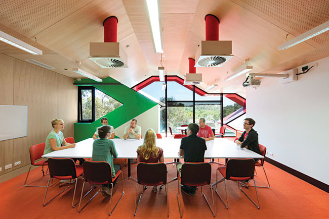 Mặt tiền toà nhà nhìn giống như một cái tổ ong với nhiều lỗ màu sắc. Nội thất bên trong cũng bị chi phối bởi những màu sắc mạnh mẽ. Thông qua các cửa sổ hình khối tổ ong, ánh sáng mặt trời dễ dàng đi vào bên trong toà nhà để giúp cho thời gian làm việc vốn đã dài của các nhà khoa học trở nên dễ chịu nhất có thể.