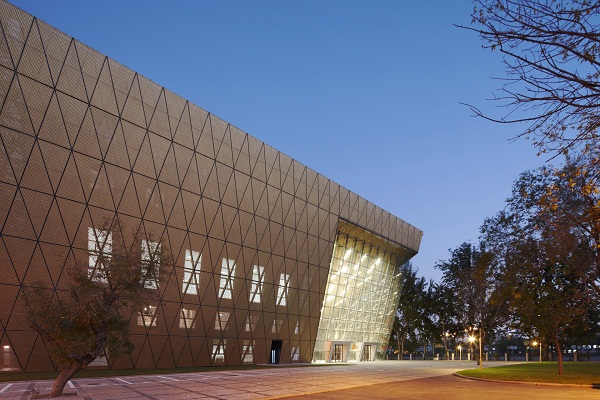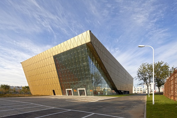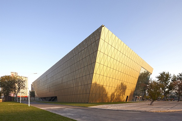 Các mặt của cấu trúc được làm bằng tấm thép đục lỗ nhỏ, có tông màu vàng, phủ khắp các mặt hình thang tạo ra hiệu ứng moiré khác thường.