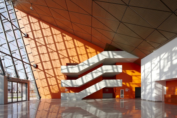Các bức tường của sảnh vào có màu cam sáng và tương phản với cầu thang bê tông.