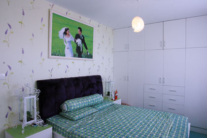 Phòng ngủ chính tràn ngập màu xanh thanh bình và sắc tím lãng mạn, theo yếu tố mộc. Đôi vợ chồng nghệ sĩ cũng chuẩn bị sẵn một phòng em bé rực rỡ, tràn đầy sức sống với tông màu xanh - đỏ nổi bật, âm hưởng yếu tố thủy.
