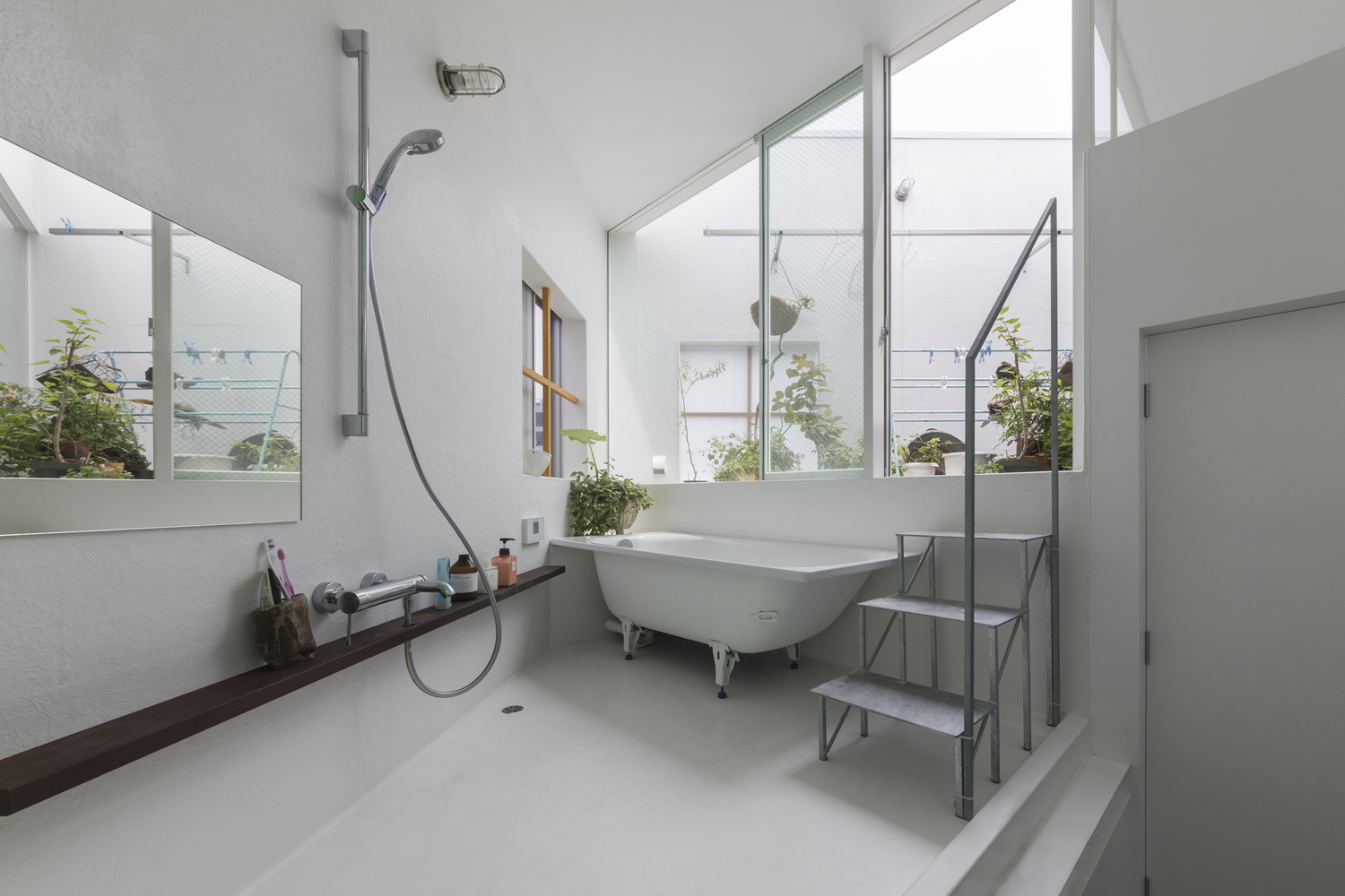 Không gian phòng tắm thoáng mát với nhiều cây xanh và là nơi duy nhất trong nhà có tường che chắn.