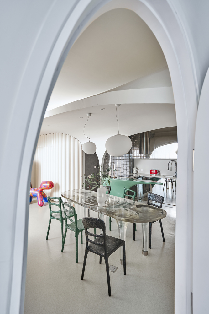 Điểm đặc trưng của căn hộ ngoài phần kết cấu là đồ nội thất kết hợp giữa phong cách hoài cổ và hiện đại như chiếc ghế ăn bằng kim loại sơn màu xanh, bàn ăn bằng nhựa lấy cảm hứng từ hiệu ứng giao thoa giữa ánh sáng và nước.