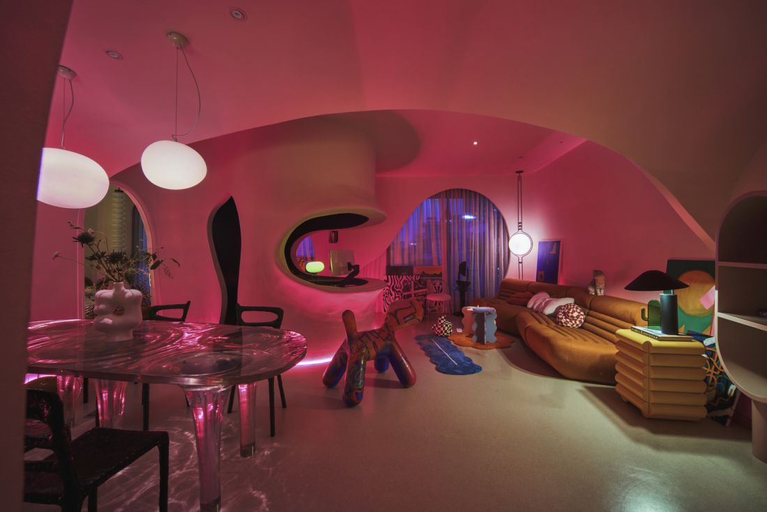 Phòng ngủ được thiết kế mở nên phòng tắm thông với phòng ngủ và chỉ ngăn cách bằng những đường cong hoặc vách kính. Căn hộ sử dụng đa sắc màu trên các đồ nội thất và những hình khối đặc trưng của phong cách thiết kế hoài cổ (Retro), viễn tưởng (Retro Future) và ngôn ngữ kỉ nguyên (Space Age).