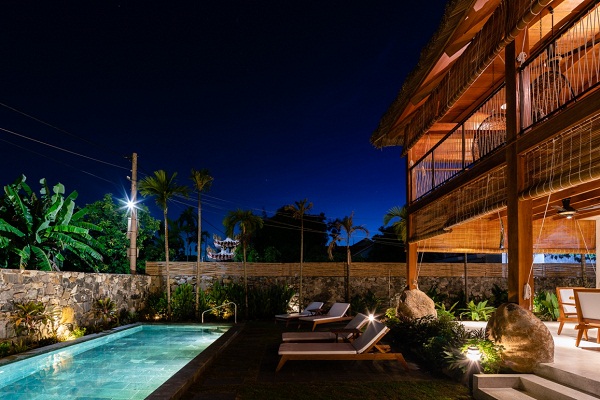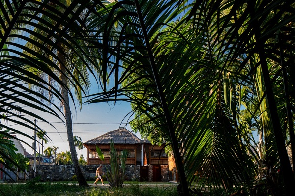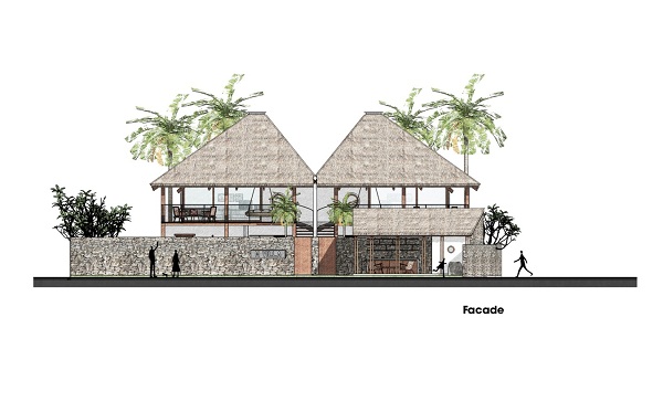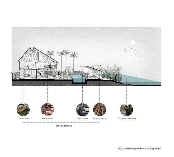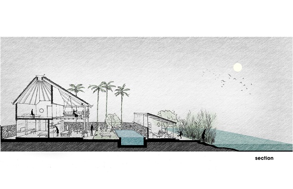 Nhóm kiến trúc sư đề xuất ý tưởng sử dụng mái lá dừa lớn bao phủ các phần chức năng bên dưới, lúc này nhìn xa biệt thự sẽ trông giống như một túp lều lớn.