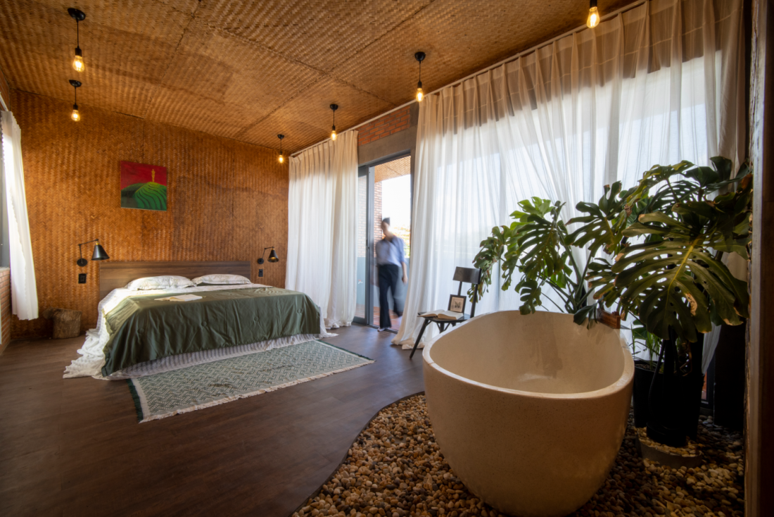 Vật liệu độc đáo: Sự kết hợp sáng tạo giữa các vật liệu truyền thống như rơm rạ, tre, gạch với các yếu tố hiện đại.