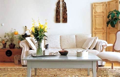 Phòng cách dịu dàng với nội thất gỗ sáng màu, sofa thấp thân thiện và ngập tràn sắc hoa.