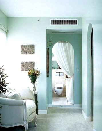 Kiến trúc cửa được thiết kế vòng cung, màu xanh biển nhạt mát mẻ tạo không khí thư thái cho không gian thư giãn trong căn nhà. Rèm cửa từ vải lanh trắng mịn rất hài hoà với màu sắc căn phòng.