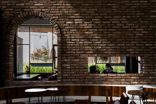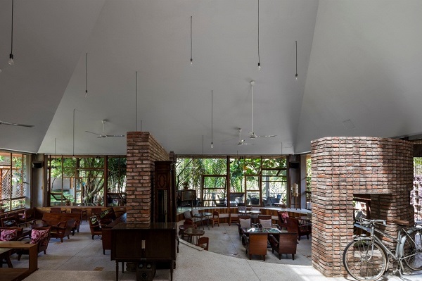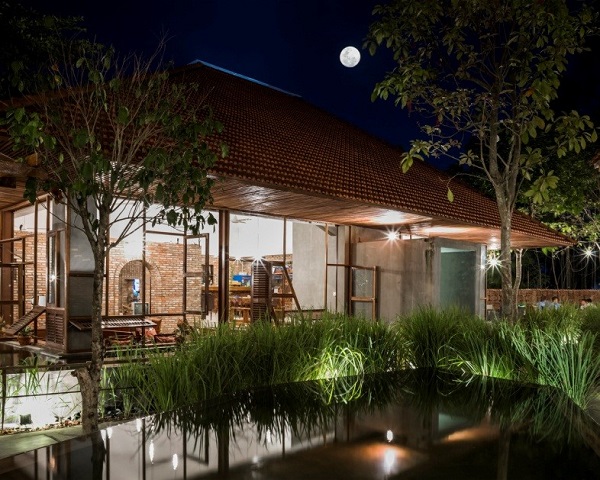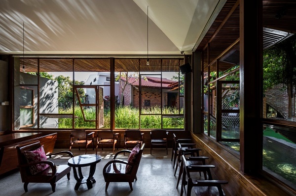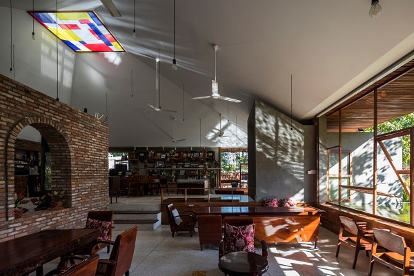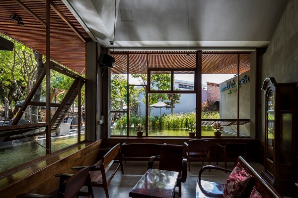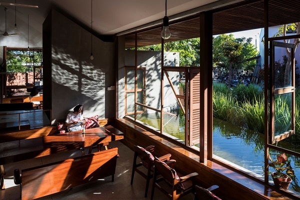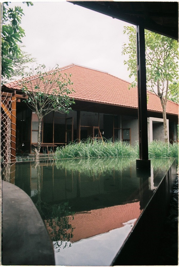 Công trình gồm có 3 gian nhà nằm xung quanh hồ nước, gian nhà chính dành cho không gian quán café, một gian nhà đa chức năng và một gian nhà phụ trợ có hình dạng là các hình học cơ bản.