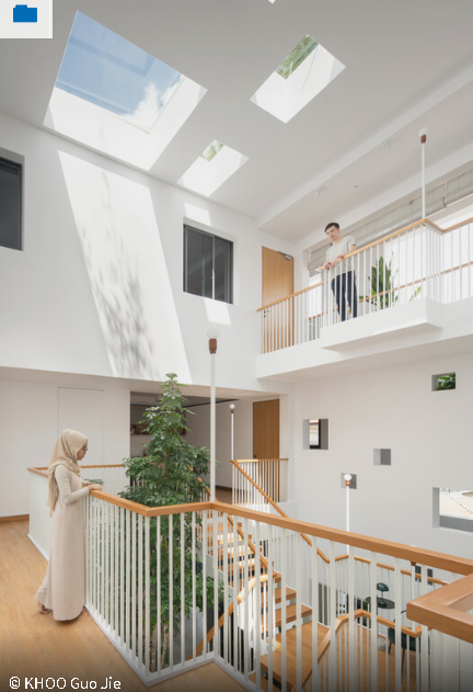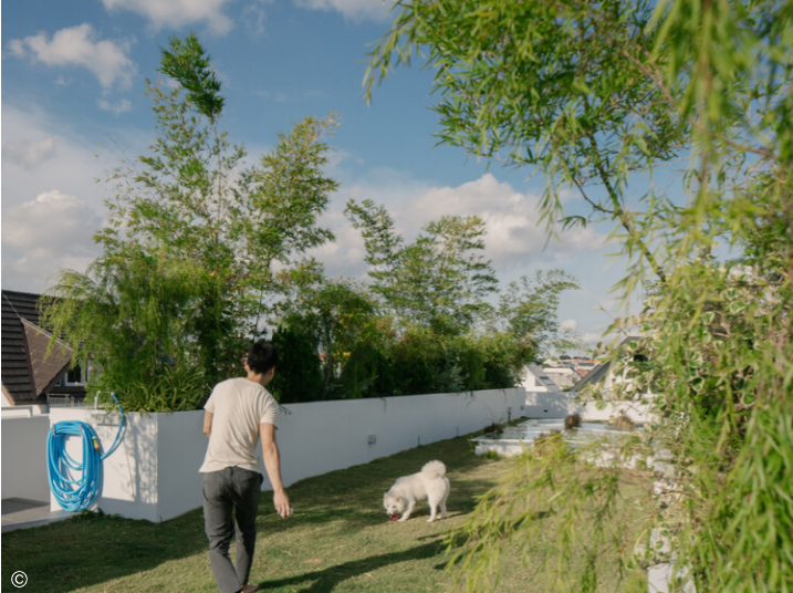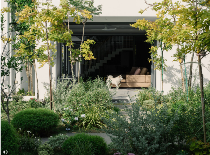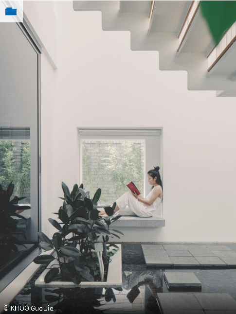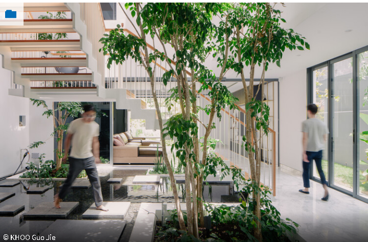 Mặt nước và cây xanh nhà lấp đầy khoảng sân, kết nối thiên nhiên với trái tim của ngôi nhà, đem đến không gian thư giãn cho các thành viên. Sân chung với giếng trời thông gió và vườn trên mái tạo điều kiện vi khí hậu trong lành, và mát mẻ cho ngôi nhà mặc dù ngôi nhà có hướng chính Tây.