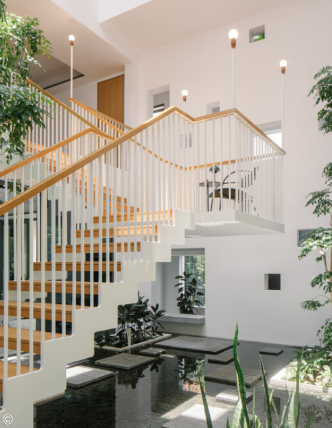 Để giảm áp lực đô thị hóa, nhà thiết kế đã thuyết phục chủ nhà không tối đa hóa diện tích sàn xây dựng mà tập trung vào chất lượng không gian sống. Kết quả là tạo ra khu vườn trong nhà rộng rãi và độc đáo trải dài 3 tầng