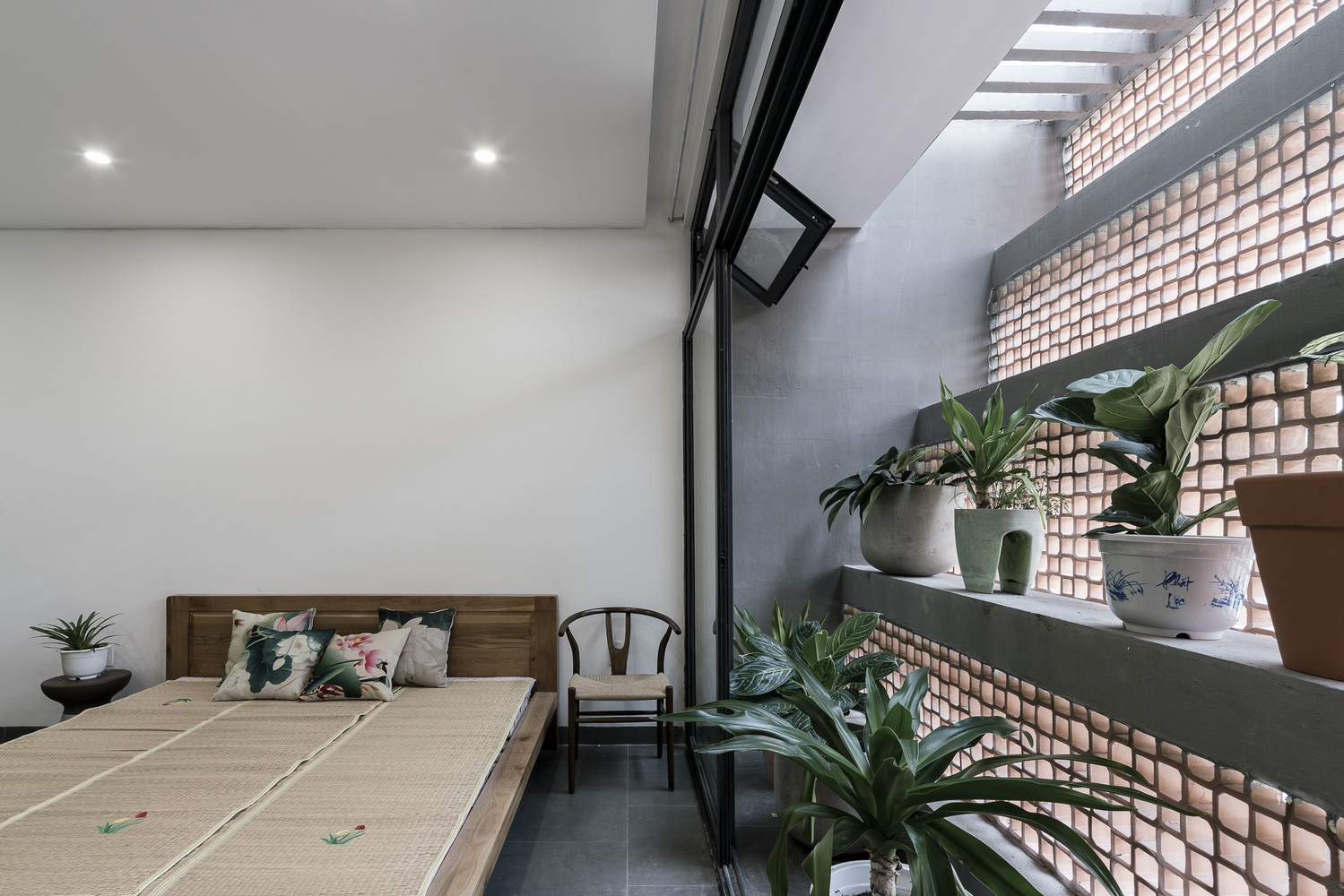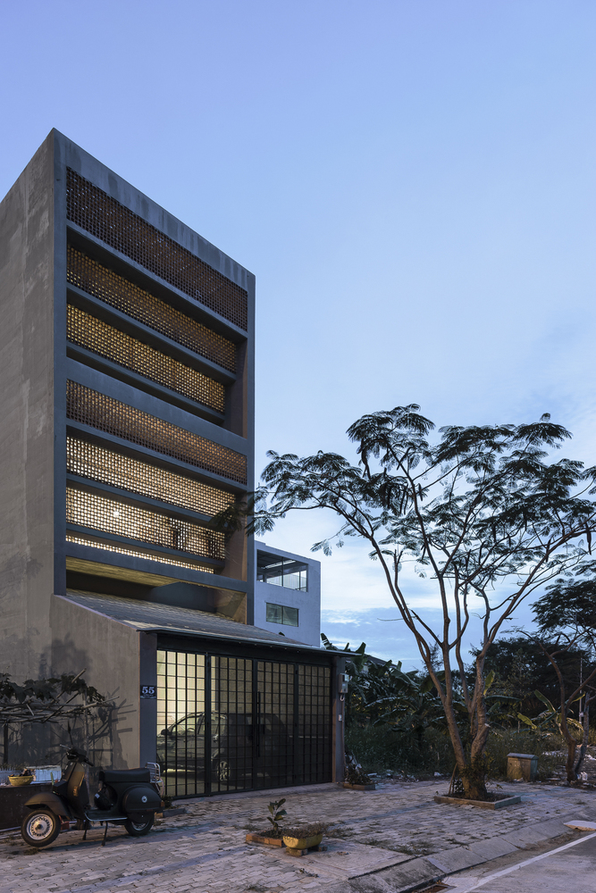 Mặt tiền chính của ngôi nhà có kết cấu dầm bê tông ngang kế hợp với gạch thông gió xây từng cấp, có chức năng chặn mưa và nắng. Sự kế hợp của gạch thông gió và lưới chống côn trùng là lớp màng bào vệ ví như tấm mùng lớn che chở các hoạt động bên trong gia đình.