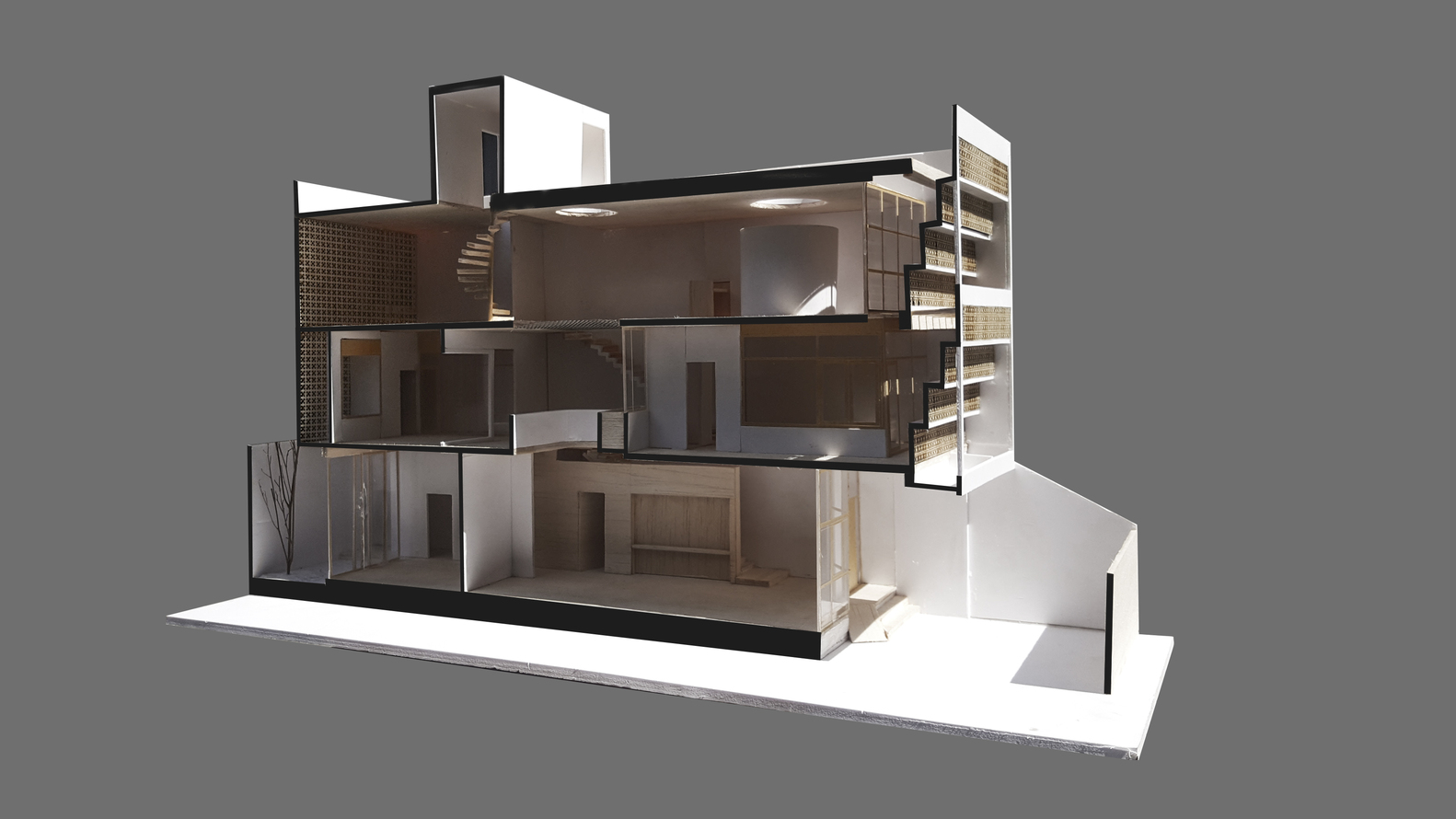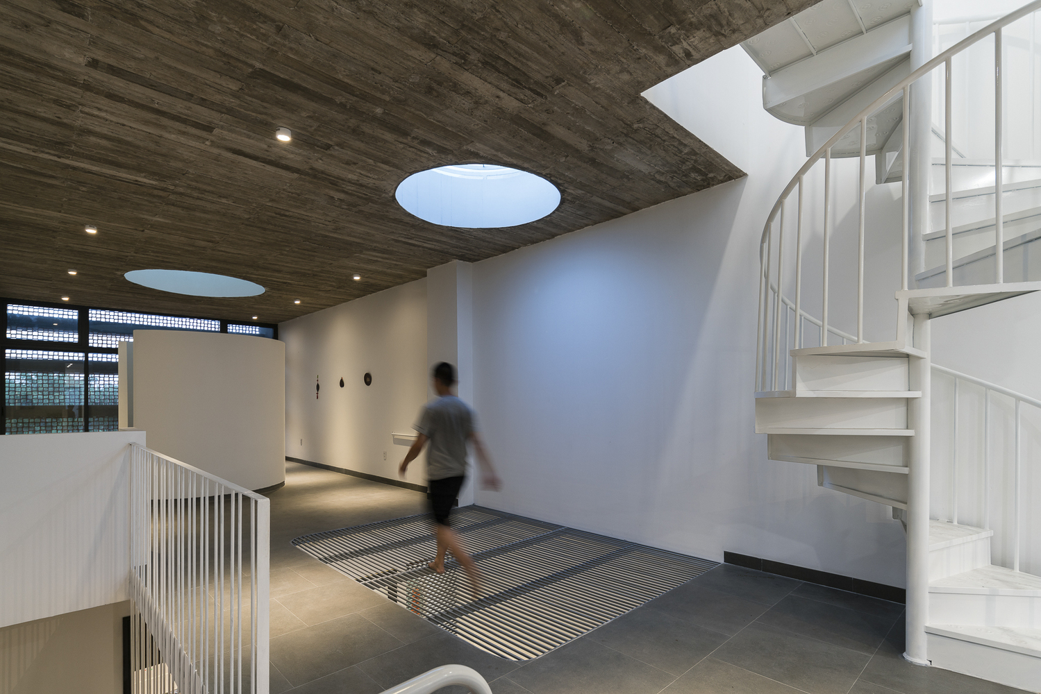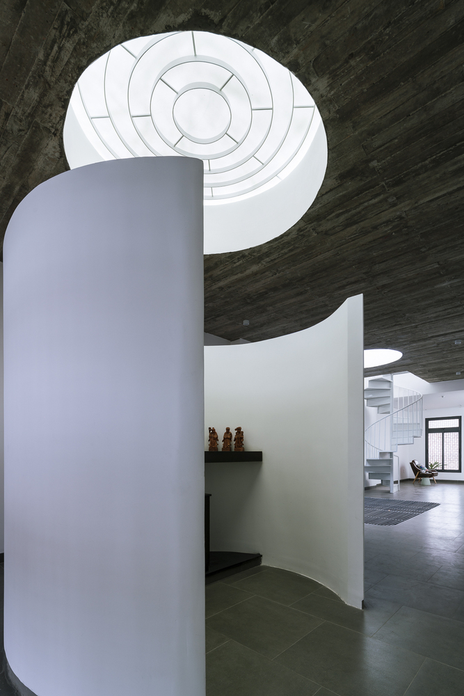 Thiết kế giải phóng theo chiều ngang ở tầng trệt và trên cùng bằng sự tiếp nối của phòng khách, phòng ăn. Tầng trên cùng dành làm sân chơi trong nhà và phòng thờ, trở thành một yếu tố hình khối trôi nổi trong không gian rộng lớn.