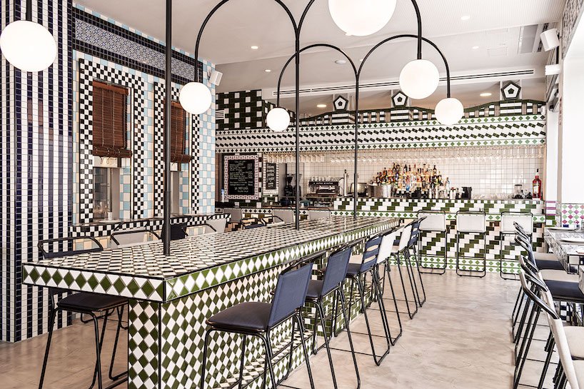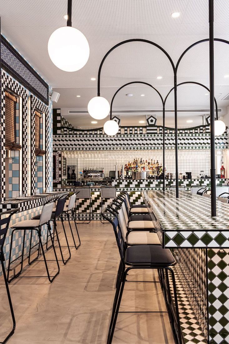 Nội thất có nhiều loại hoa văn bằng gạch được thiết kế đa dạng, tùy chỉnh, mô tả mặt tiền khu phố. Tâm điểm chú ý là quán bar, với đồ trang trí và hình vẽ kỳ dị, cùng bộ sưu tập nhiều loại rượu mạnh ở khu vực cocktail.