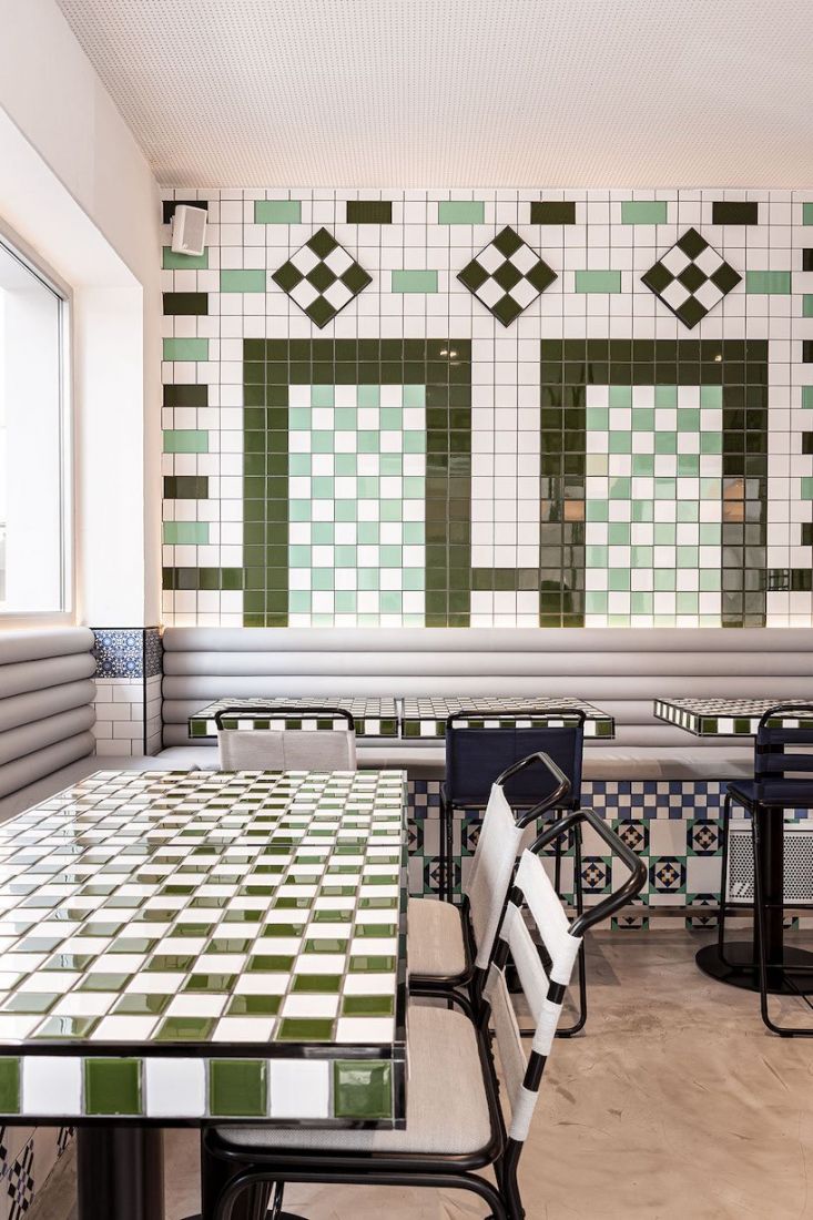 Các nhà thiết kế sử dụng vật liệu chính là gạch men và đất sét thủ công tạo mẫu riêng cho nhà hàng.
