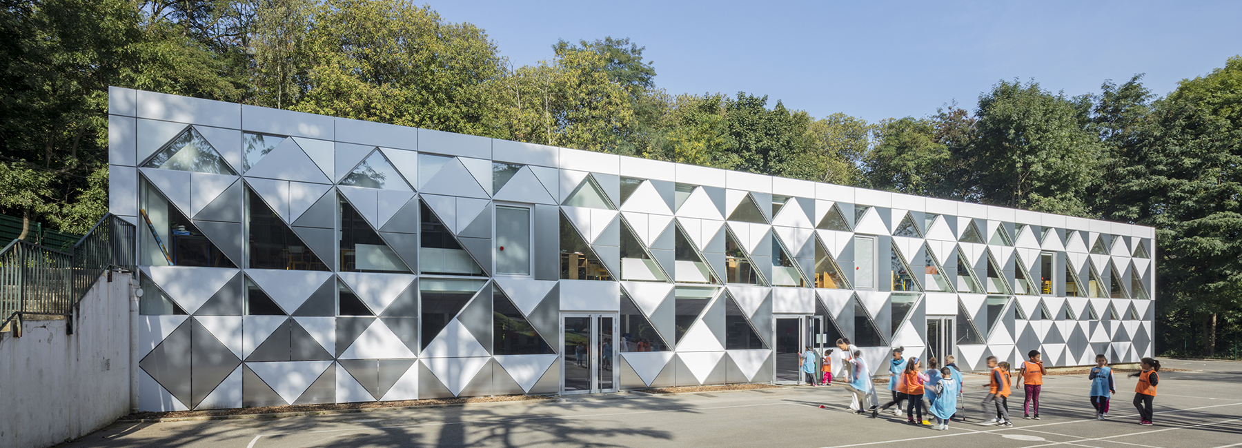 Trong lần cải tạo xây dựng mới, một nhóm các nhà kiến trúc sư địa phương đã biến hóa mặt ngoài dải trường học thành một lớp áo mới.