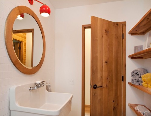 Cửa chính được cấu tạo từ tấm gỗ dày và chắc. Bên trong được gắn chốt sắt chắc chắn. Phòng tắm màu trắng trang nhã kết hợp với kệ để đồ, viền gương treo tường cho cái nhìn phong cách.