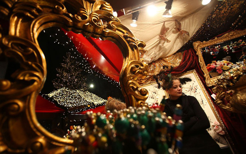 | Một người bán hàng trong quầy hàng tràn ngập đồ Giáng sinh của mình. Ảnh: EPA |