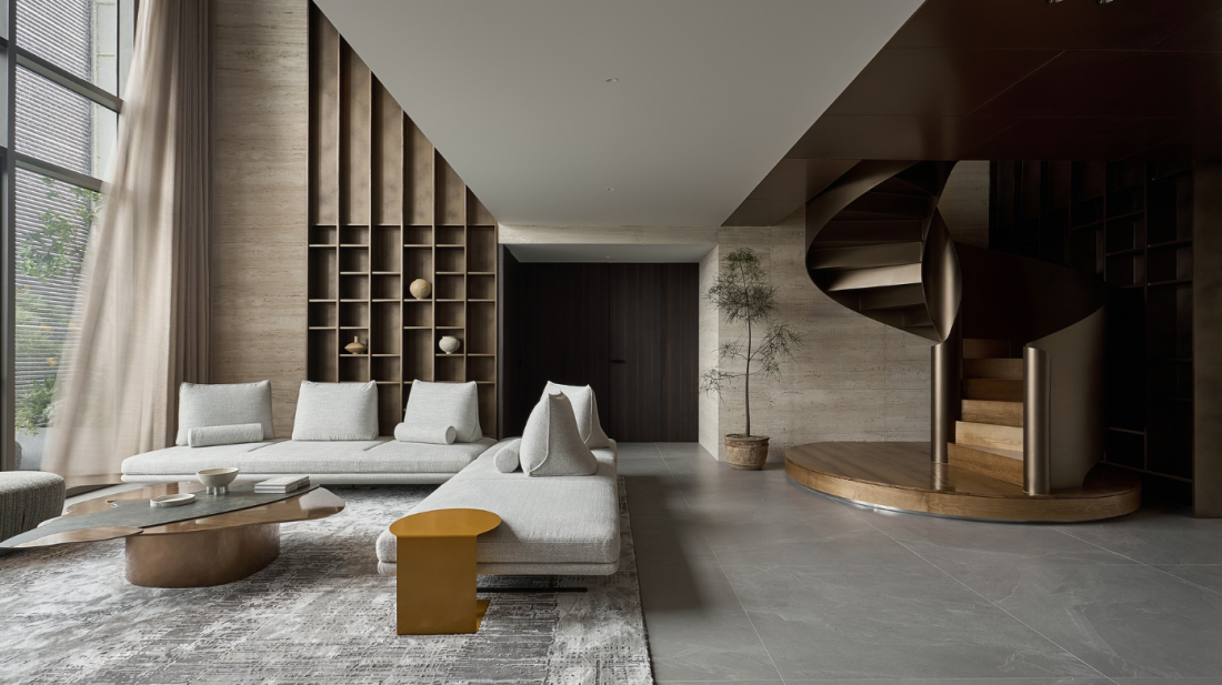 Đường cong mềm mại của cầu thang xoắn không chỉ giúp tiết kiệm diện tích mà còn tạo ra điểm nhấn thị giác cực mạnh, làm dịu đi những đường thẳng của cấu trúc tổng thể.