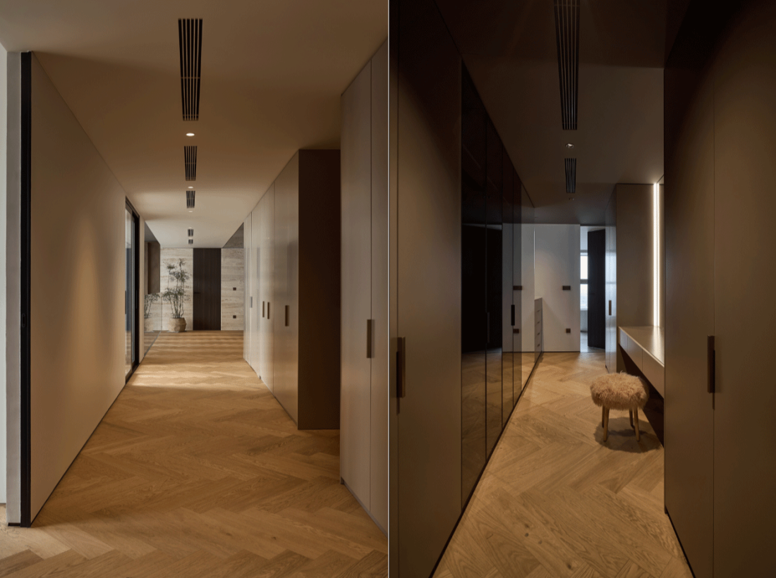 Bằng cách kết hợp các chất liệu cho đồ nội thất và sàn nhà gỗ xương cá, tính liên tục được duy trì xuyên suốt tầng trên tại hành làng và trong phòng ngủ.