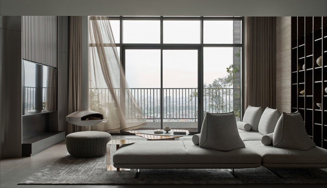 Cửa kính bản lớn thay tường nên phòng khách ôm trọn tầm nhìn panorama