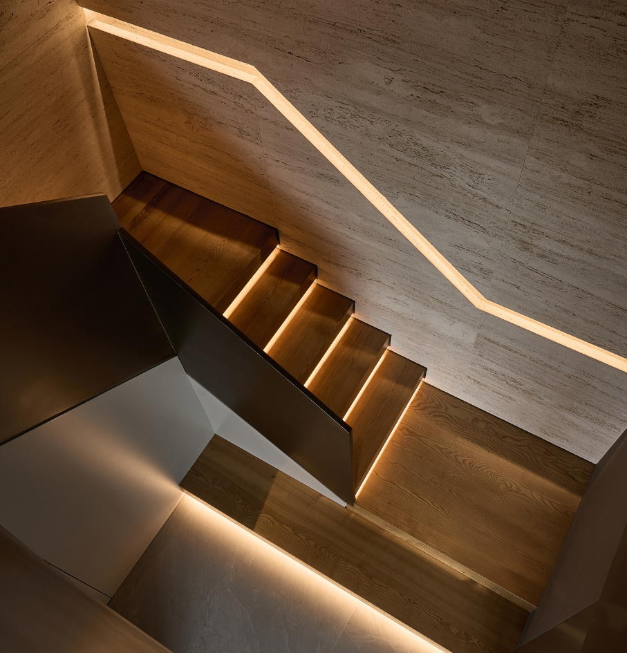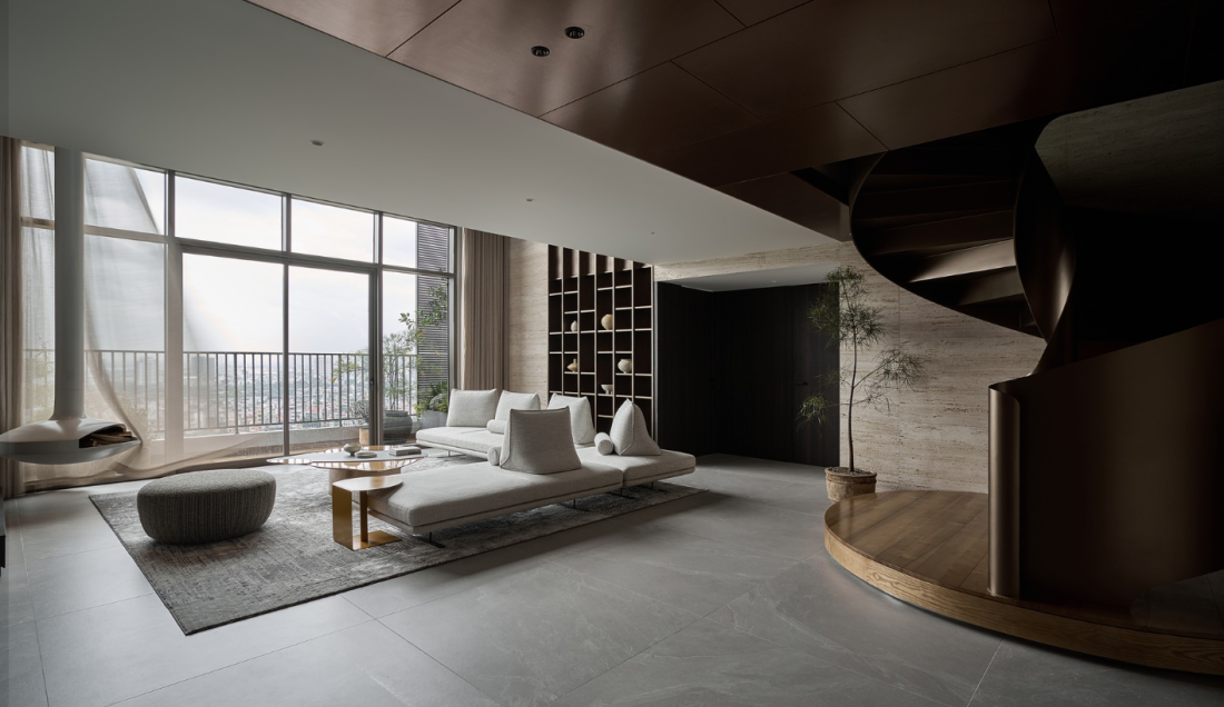 Để kết nối hai tầng penthouse này, các kiến trúc sư đã sử dụng hai hệ thang tại hai đầu đối diện, tạo ra một luồng lưu thông mềm mại gồm Cầu thang thẳng và cầu thang xoắn. Trong đó, cầu thang thẳng đại diện cho sự mạnh mẽ, dứt khoát của ngôn ngữ kiến trúc hiện đại. Còn cầu thang xoắn một tác phẩm điêu khắc đúng nghĩa.