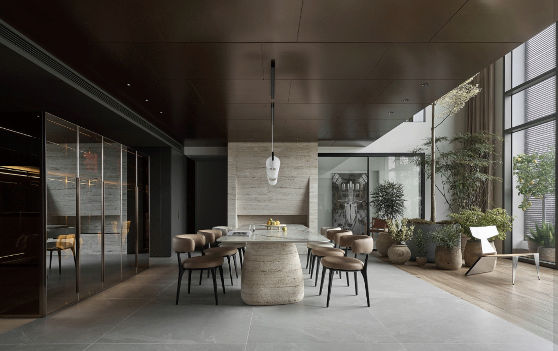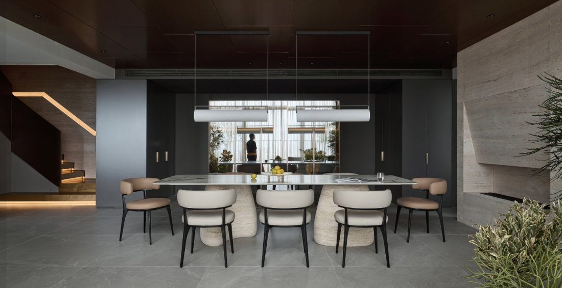 Ngôn ngữ kiến trúc hiện đại của căn penthouse được thể hiện qua sự tương phản vật liệu đầy tinh tế. Bề mặt nhám sần, thô mộc của đá mang lại cảm giác vững chãi, gần gũi với mặt đất.