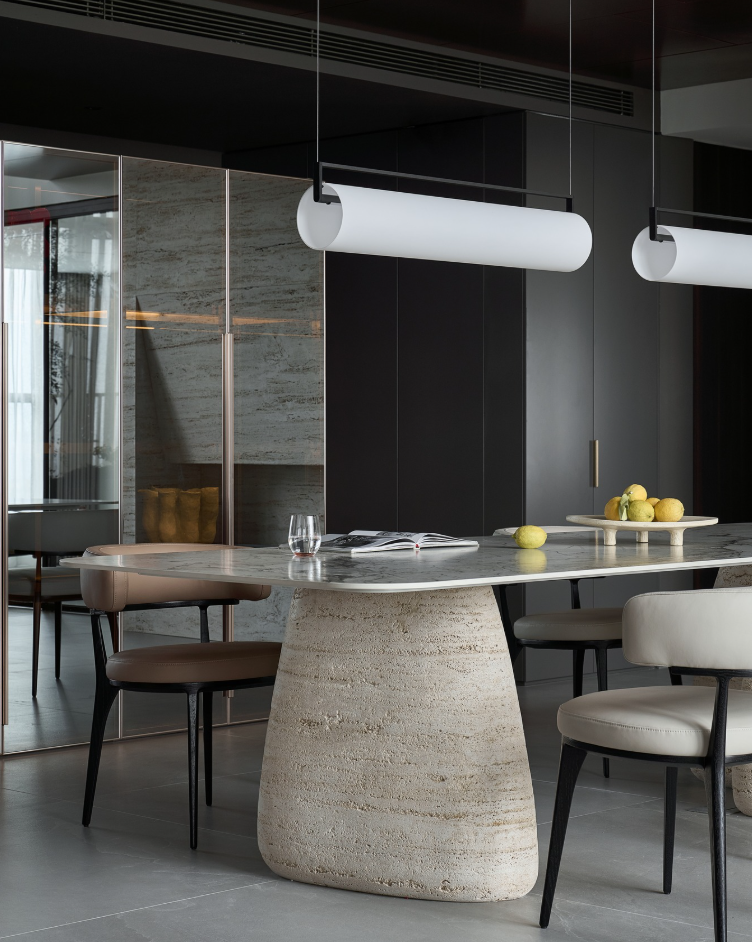 Bàn ăn đá granite kết hợp chân bàn uốn cong tinh xảo nhấn mạnh sự độc bản trong thiết kế.