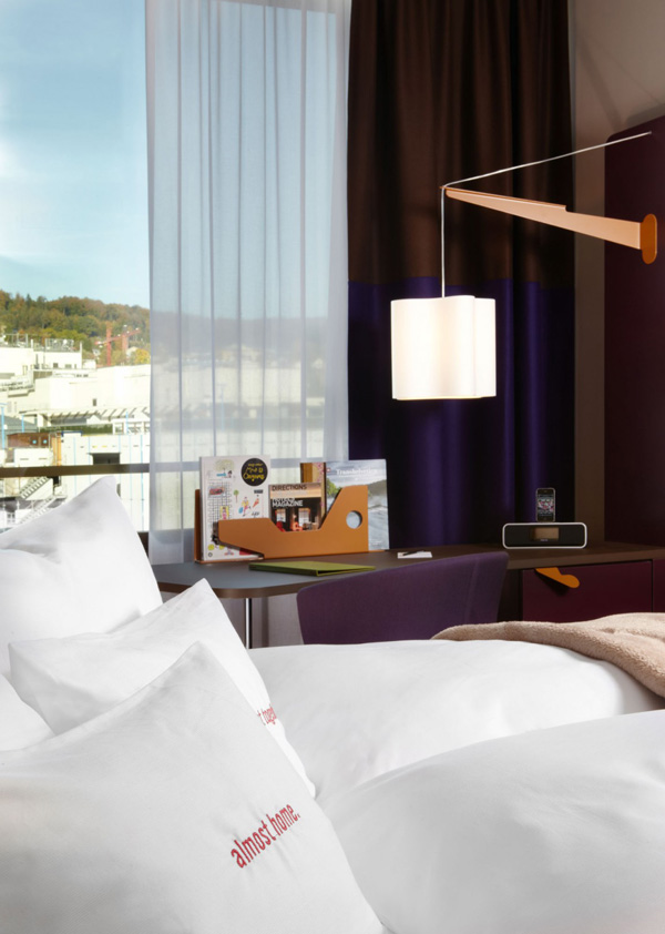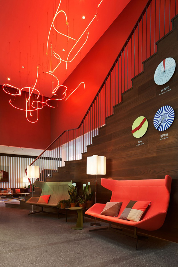 25 Hours là một trong những tòa nhà cao nhất tại phía tây Zurich, được thiết kế bởi Alfredo Häberli Design Development và Aeberli Vega Zanghi Architekten. Xuyên suốt toàn bộ không gian của khách sạn là những gam màu rực rỡ, trải khắp trên đồ nội thất, tường, đèn màu, tranh, rèm, thảm... Các gam màu nóng - lạnh, trầm - sáng được phối với nhau một cách hài hòa, ấm cùng mà mát mẻ không tạo cảm giác rối mắt, hỗn độn hay ngột vì quá nhiều màu sắc.